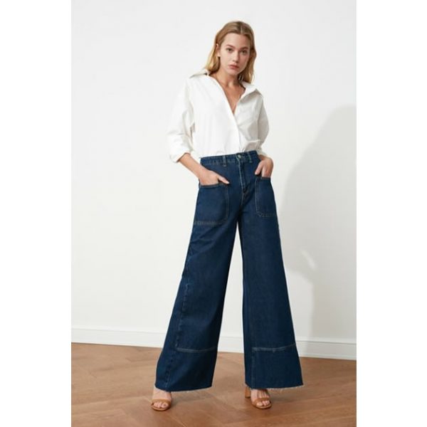 TRENDYOLMİLLA Koyu Mavi Dikiş Detaylı Yüksek Bel Wide Leg Jean