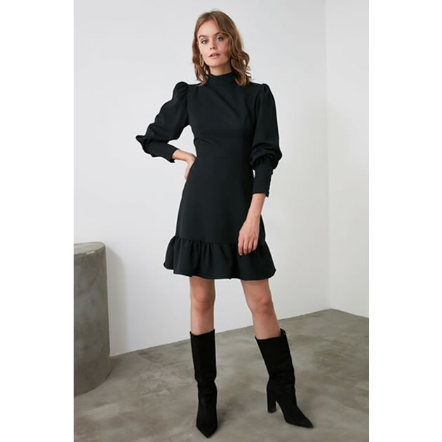 TRENDYOLMİLLA Kadın Siyah Dik Yaka Volanlı Elbise